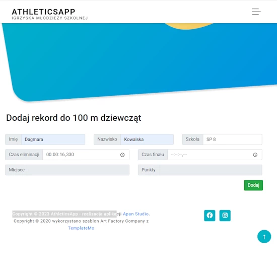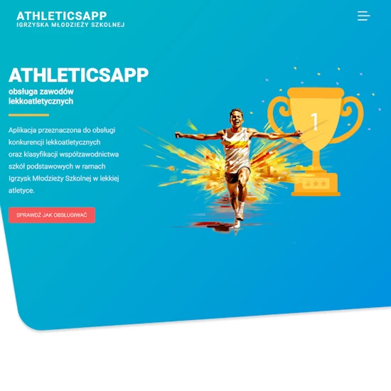AthleticsApp – dostęp do aplikacji webowej przeznaczonej do obsługi konkurencji lekkoatletycznych oraz klasyfikacji współzawodnictwa szkół podstawowych w ramach Igrzysk Młodzieży Szkolnej w lekkiej atletyce. Zautomatyzowane zliczanie punktacji zawodników w poszczególnych konkurencjach oraz klasyfikacji szkół. Aplikacja daje możliwość wydruku wyników do pliku pdf.