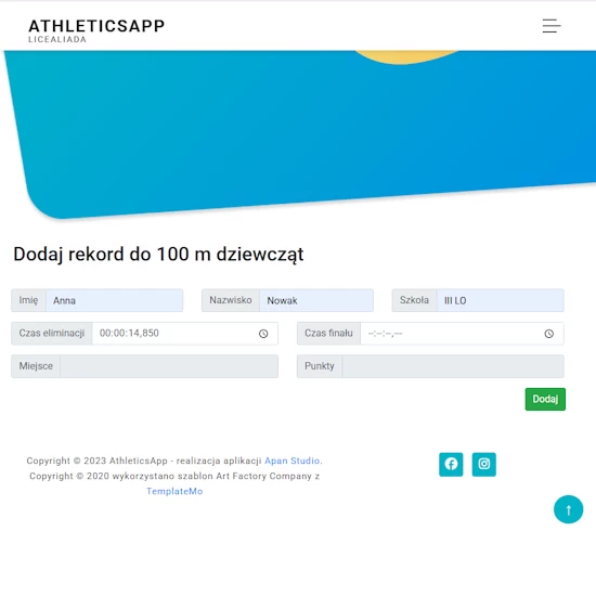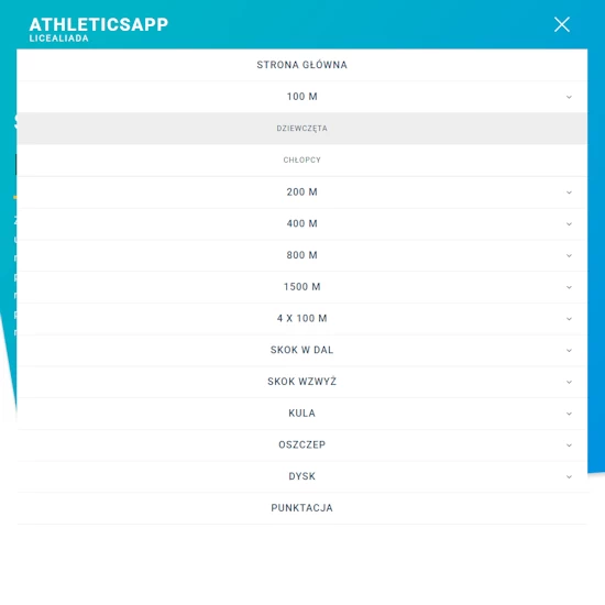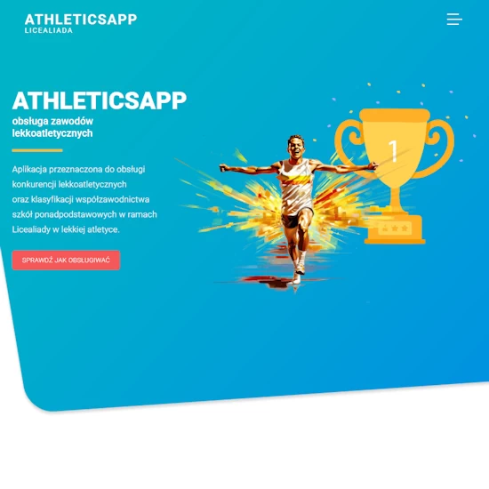 AthleticsApp – dostęp do aplikacji webowej przeznaczonej do obsługi konkurencji lekkoatletycznych oraz klasyfikacji współzawodnictwa szkół ponadpodstawowych w ramach Licealiady w lekkiej atletyce. Zautomatyzowane zliczanie punktacji zawodników w poszczególnych konkurencjach oraz klasyfikacji szkół. Aplikacja daje możliwość wydruku wyników do pliku pdf.